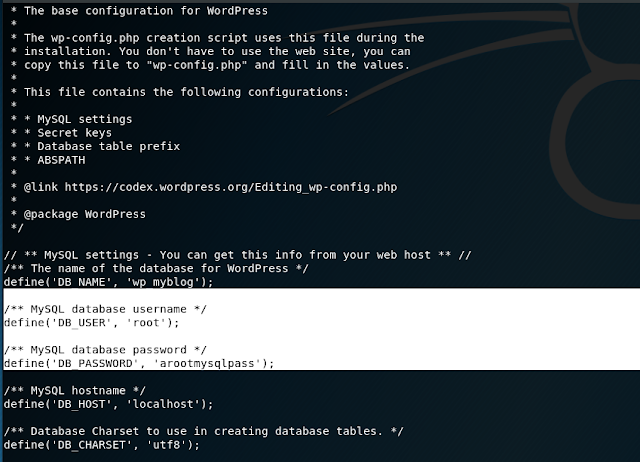 Now it's time to enumerate for privilege escalation. I first headed to the wp-config.php file out of habit since creds are always laying around in there based off past VM experience, and sure enough we got a root creds for the mysql database.