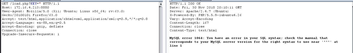 Using Burp Suite, the request sending a fake key was captured, and it was determined that this was susceptible to SQL injection through manual testing.