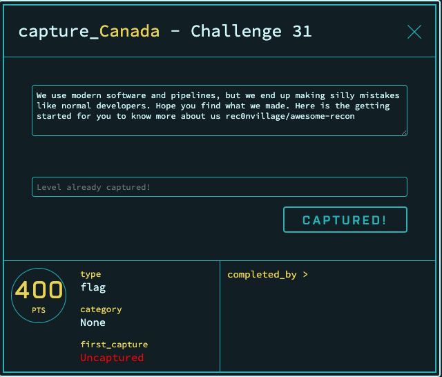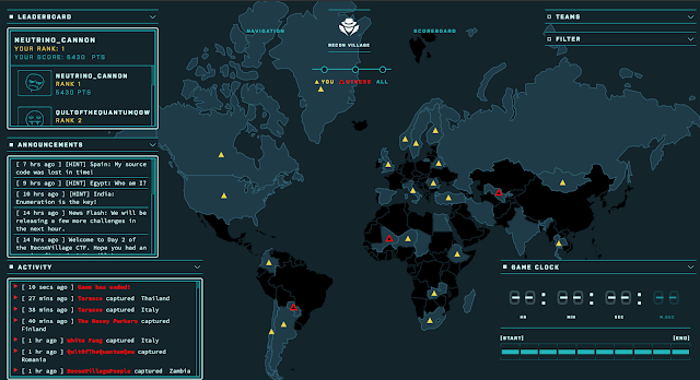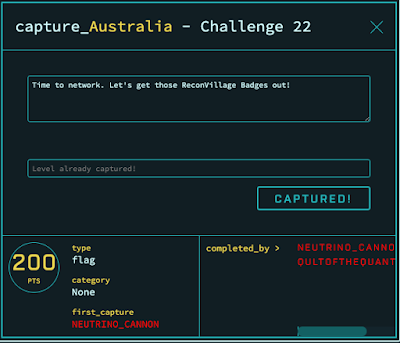 My CTF team, Neutrino Cannon, participated in the Recon Village CTF at Defcon 27 once again for the third year in a row, and as the saying goes "the third time is the charm" as we managed to finish in first place. We dedicated almost all of our time at Defcon to the CTF, and the team's unwavering focus to complete challenges locked in the victory.There were a lot more challenges this year than in past years, and while this write-up will include most challenges, it will not be a fully inclusive list. However, the official write-up from the Recon Village team should be released in the coming days, so be sure to check that out as well.